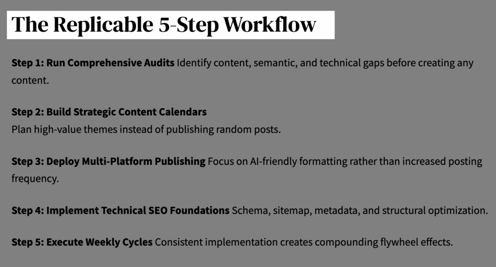 55% of Google searches now result in AI overviews, but only 52% of cited sources come from traditional top 10 results4. This shift means generic content gets buried while strategically optimized content breaks through to AI citations.