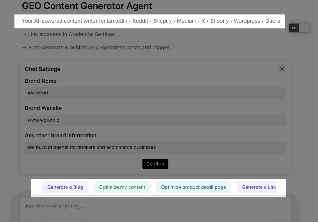 WorkfxAI’s agent publishes optimized content across WordPress, Shopify, LinkedIn, Reddit, and X simultaneously—something ChatGPT cannot do9. Each platform receives: