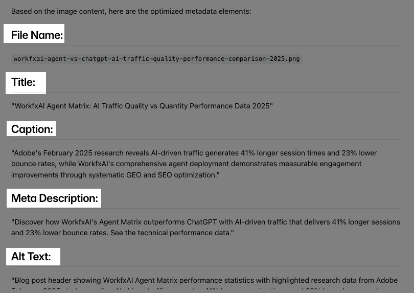 WorkfxAI automatically generates and implements schema markup that makes content AI-readable10. This includes: