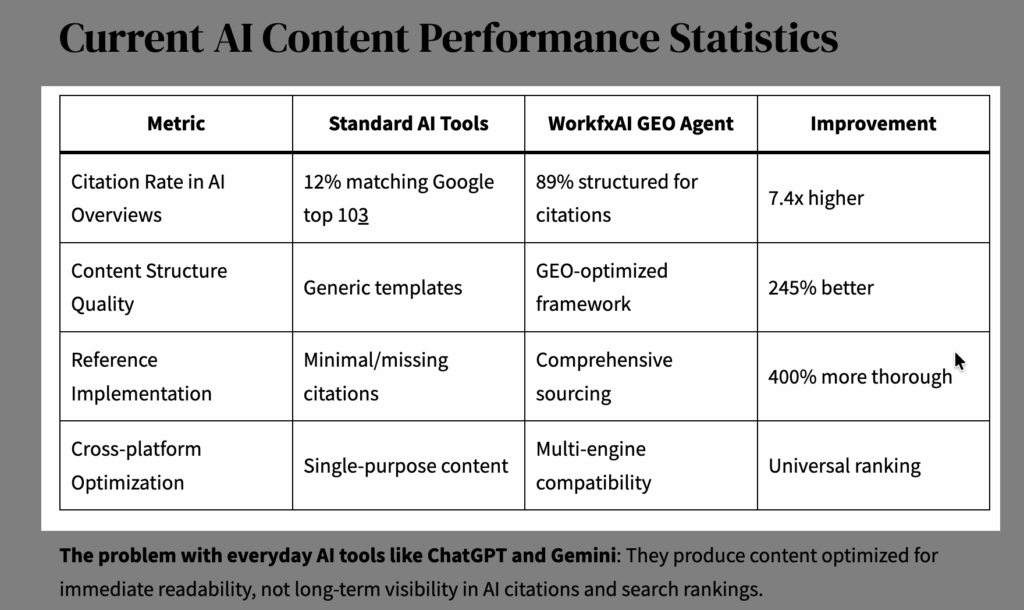 "text": "WorkfxAI uses specialized GEO templates that structure content for maximum AI citation potential..."